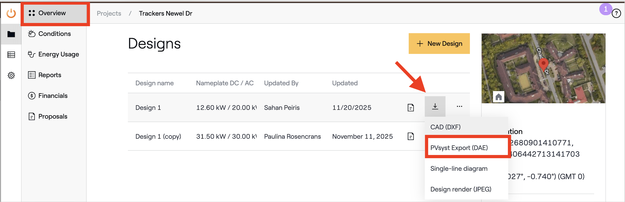 While in a Project, click the Overview section, click the download button, then Select PVsyst (DAE)