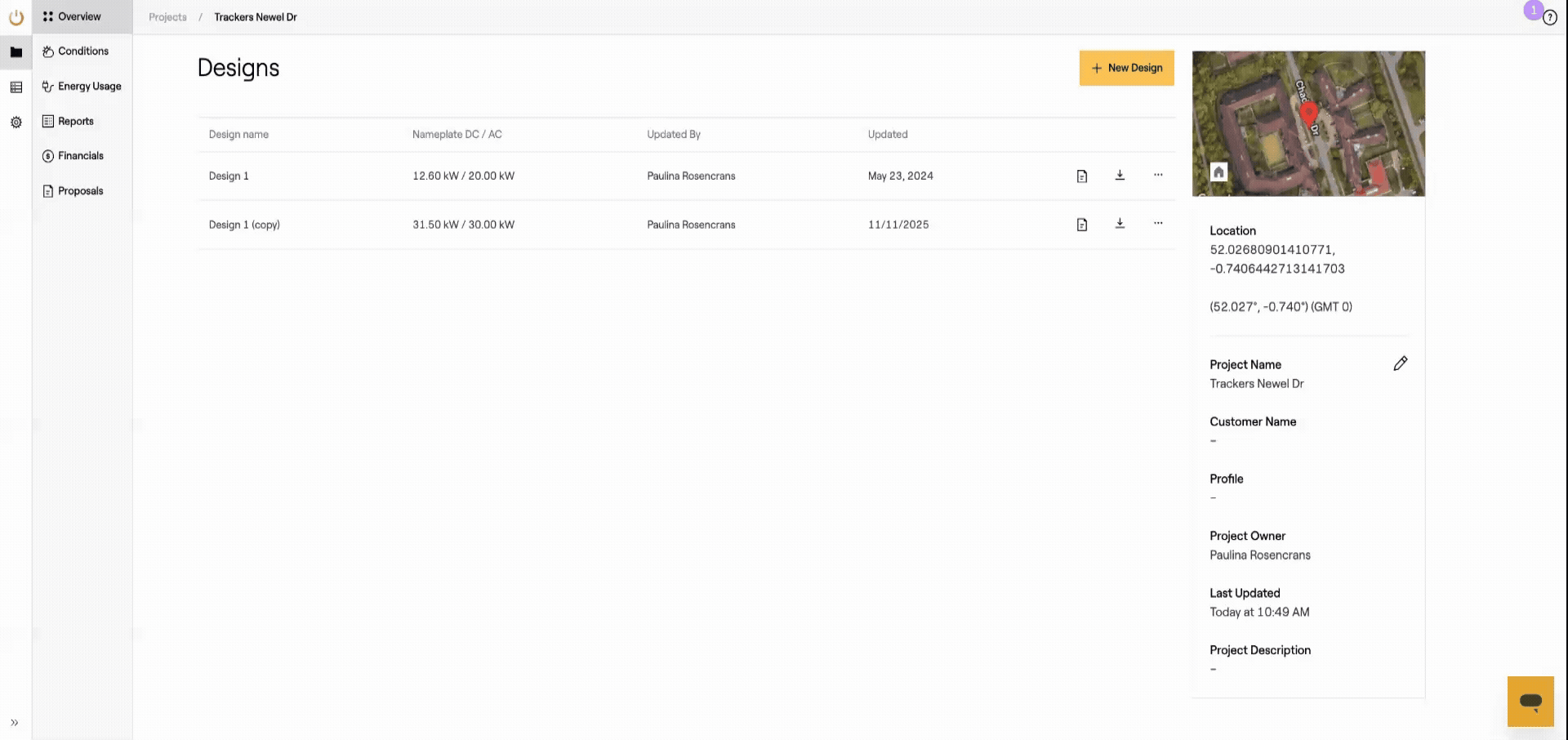 The Overview Page has been updated to display a list of all designs included in the Project, along with their names, nameplate DC, and AC ratings. Here you can create a "New Design", take a "View the details of each Design", download DXF, DAE (only available for customers on the Enterprise Plan), Single-line diagram, and Design render (JPEG). Lastly, by clicking the three dots on the right side, you can rename, lock, and delete a Design.