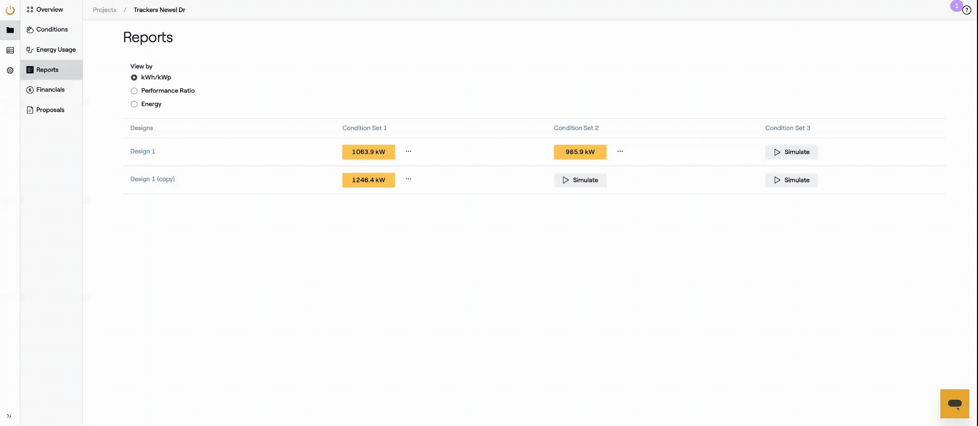 The updated Reports Page enables users to simulate Designs for each available Condition Set, download the Shade Report, and the 8760 CSV file. Additionally, users can follow the simulation progress and check metrics like kWh/kWp, performance ratio, overall system production in kWh, and access the Production Report.