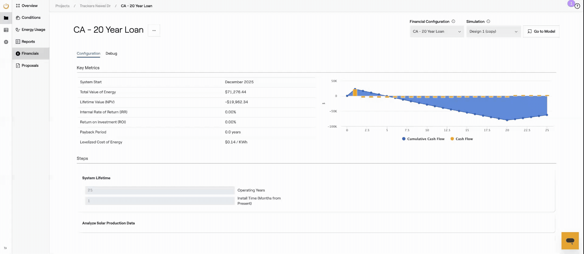 On the Financials Tab, the Financial model can be renamed and deleted, and information about the model and project results can be viewed. To view detailed annual values relevant to the Project, users can access the Debug table. Additionally, a different Financial model can be selected as well as the Design that the model applies to.