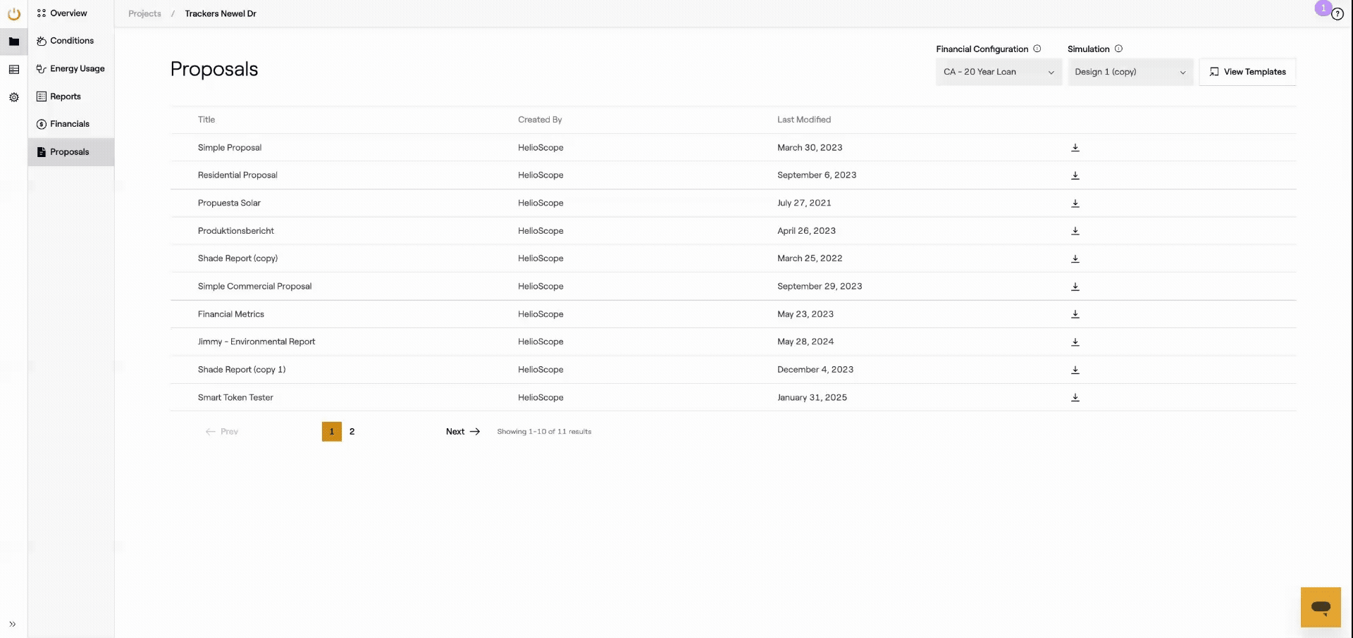 The Proposals Page displays the team's account "Favorite Proposal templates" for download. Also, a different Financial model can be selected, as well as the Design that the model applies to.