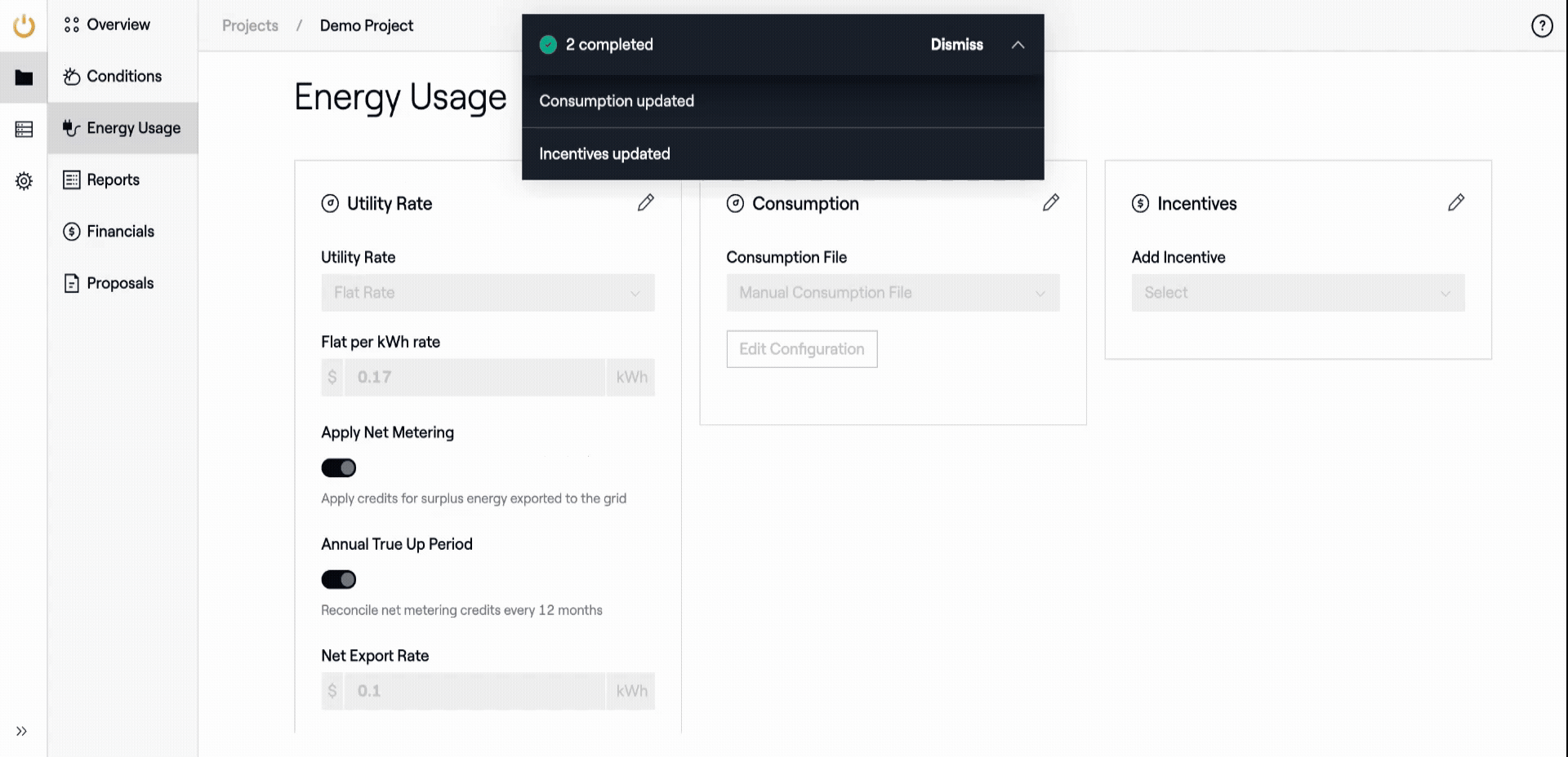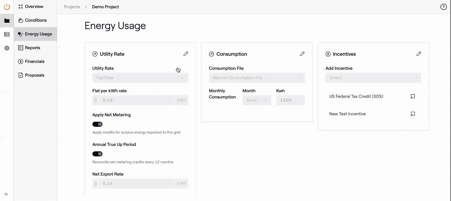 On the new Energy Usage Page, users can set or select the utility rate, add incentives, and enter or upload consumption data for the financial analysis of their project