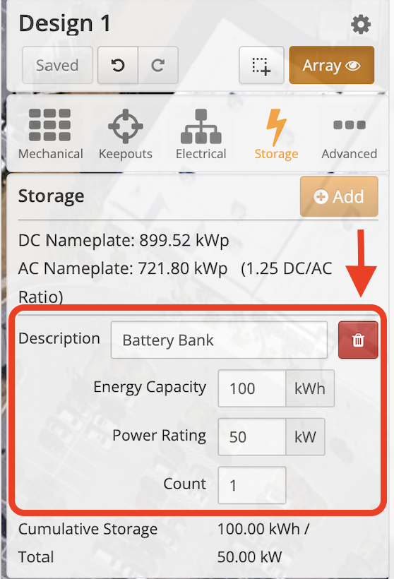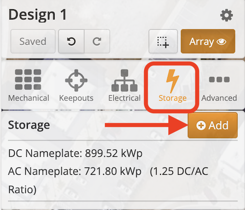 To add a battery to your HelioScope design, go to the Storage tab and click +Add