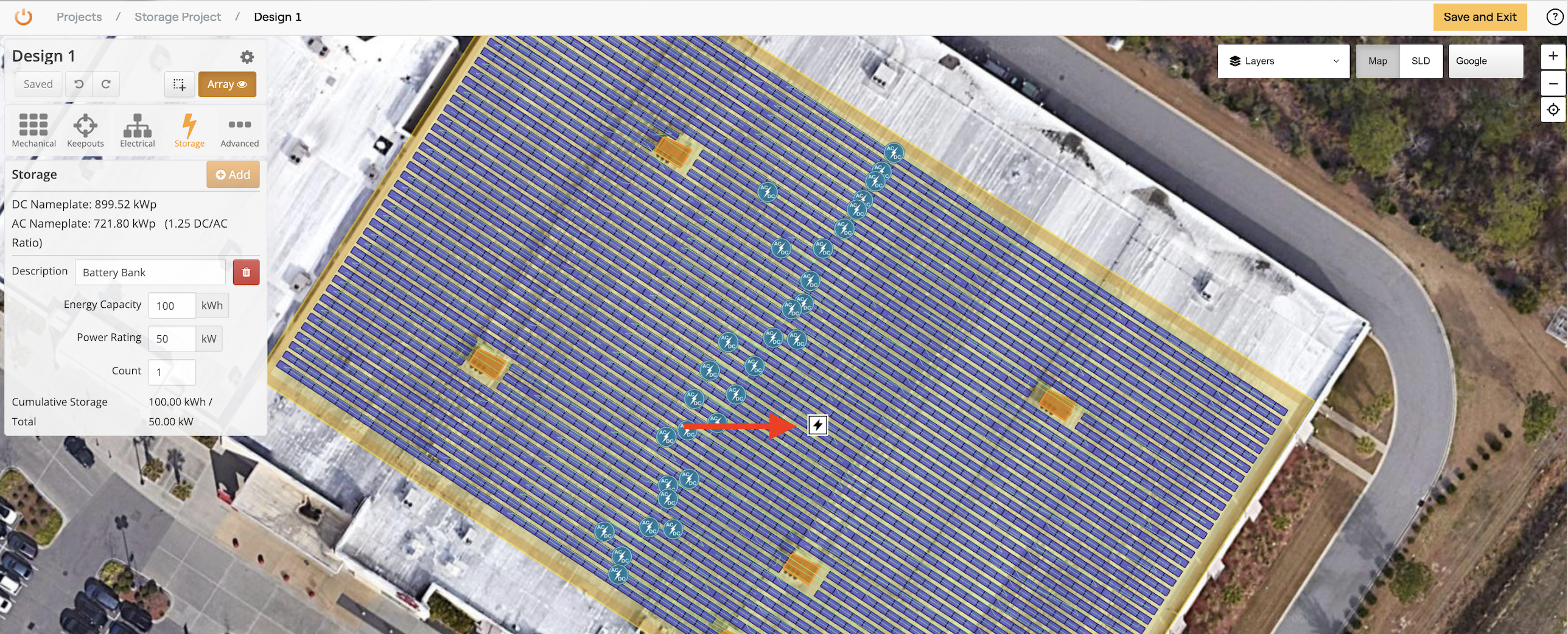 Once the information of your system is added you will see a storage icon displayed on your design. The battery placement defaults to the PCC based on the address/coordinates of the project. You can adjust its location by dragging the battery icon