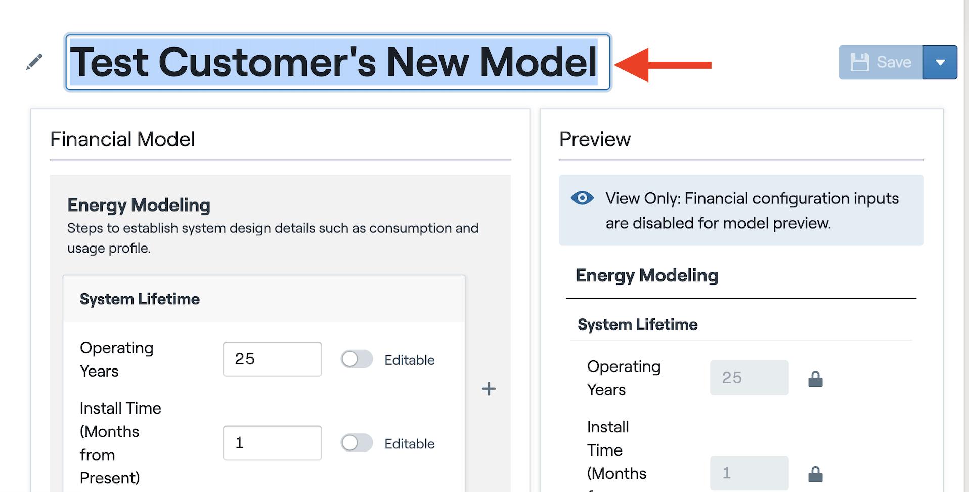- Note: You will make your edits on the left side under Financial Model. The right side under Preview will show you how the financial configuration will behave in your projects.