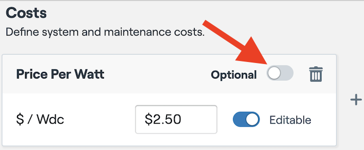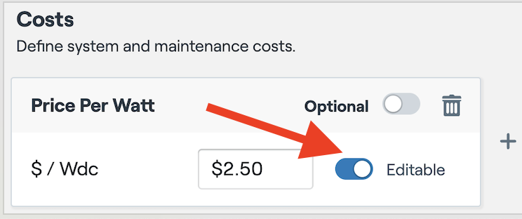 5. A financial input can be made either editable or non-editable in a project by toggling the Editable button, as shown below