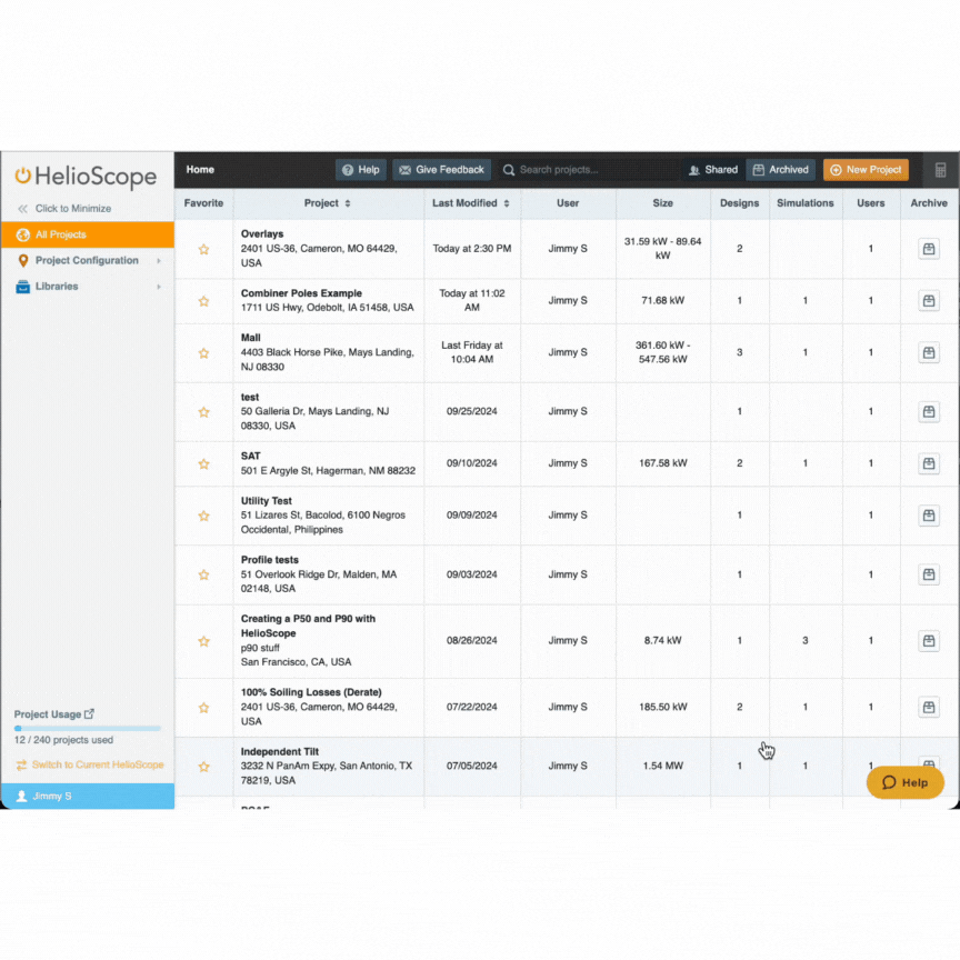 - Make sure you are in the Home page. If you are inside a Project Overview, go back to the Home page with the Project menu list by clicking on Home or on HelioScope.
