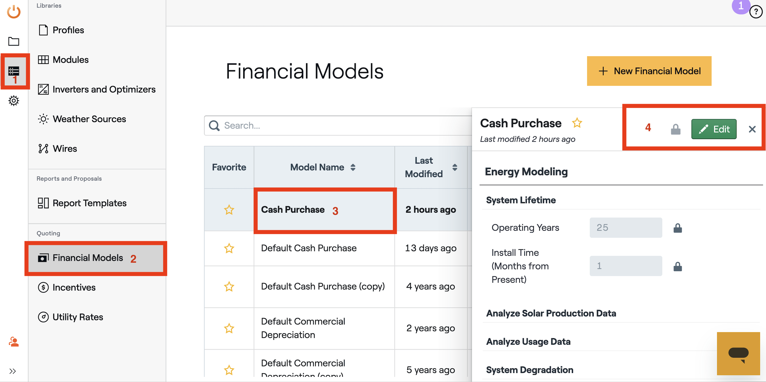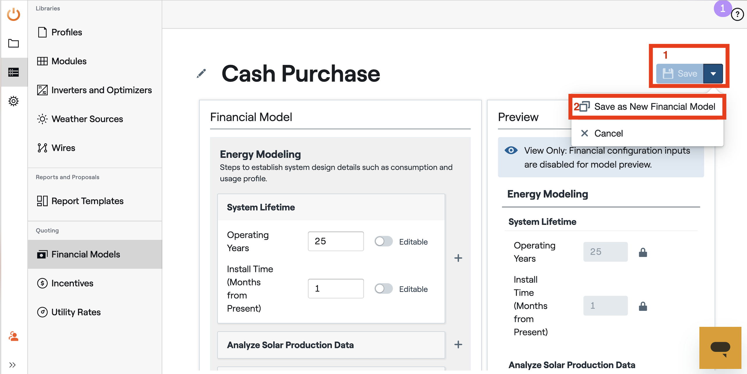 There are two types of Financial Models in Financials and Proposals that users can Clone: HelioScope default Financial Models and user-created Financial Models.