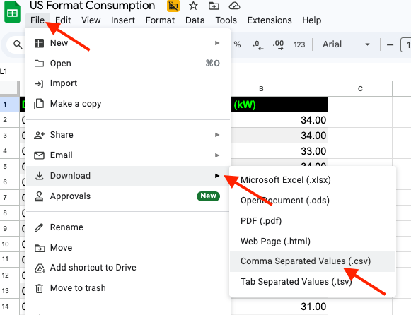 - At the top of the screen, select File > Download > Comma Separated Values (.csv)