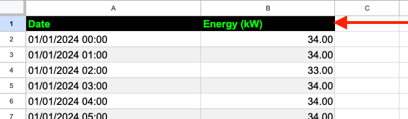 - Enter the Date & Time into Column A (keep track of the format you use as you will need it for upload) and Energy (in kilowatts) in Column B.